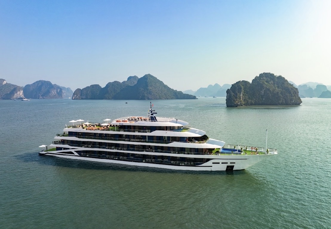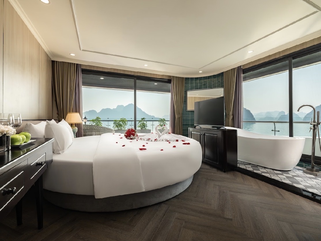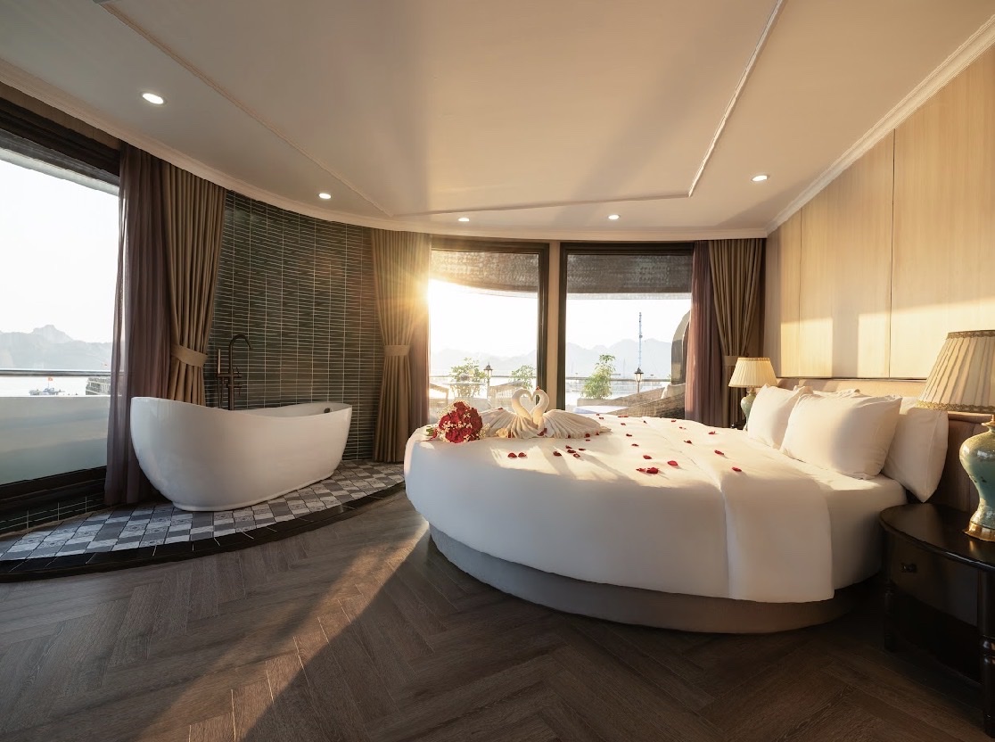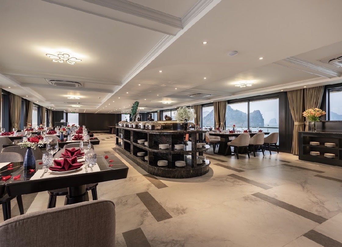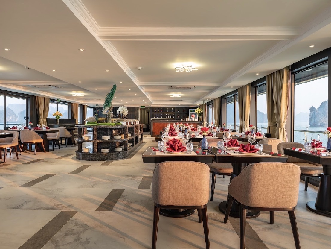 - 19h00: Quý khách thưởng thức bữa tối với set menu tại nhà hàng trên du thuyền
