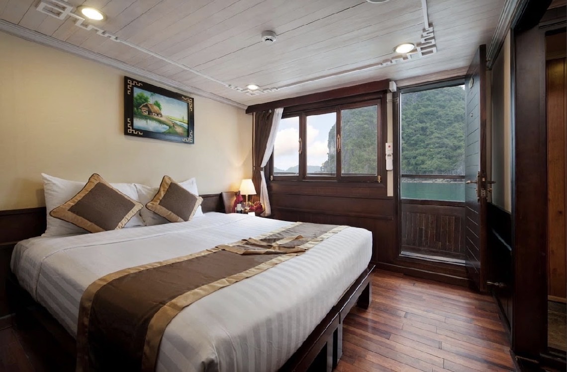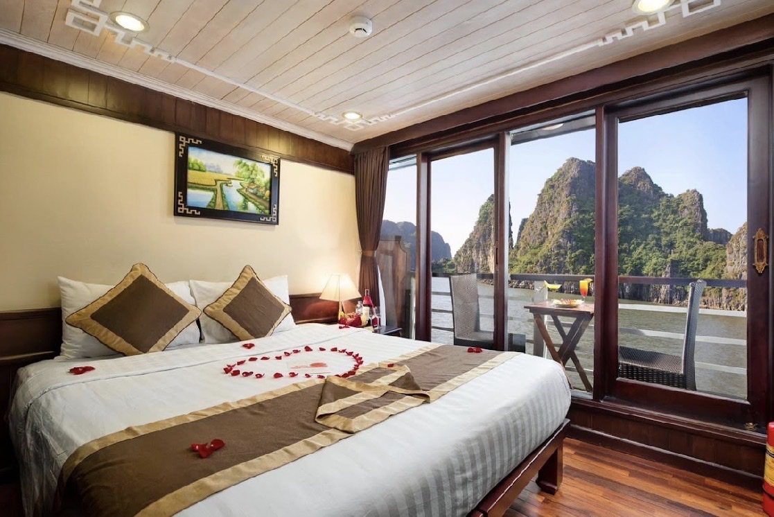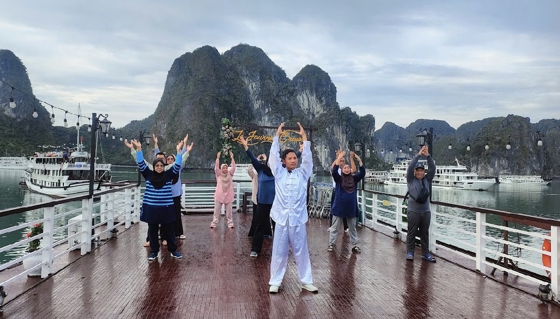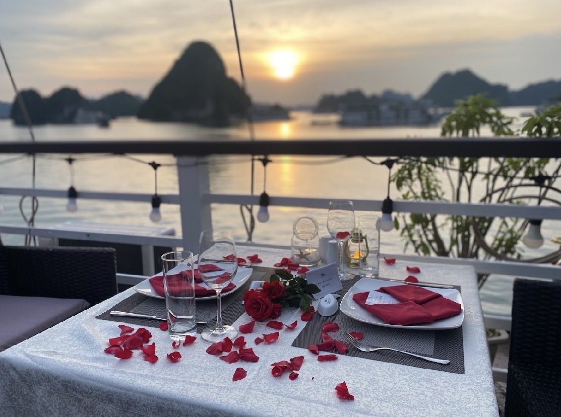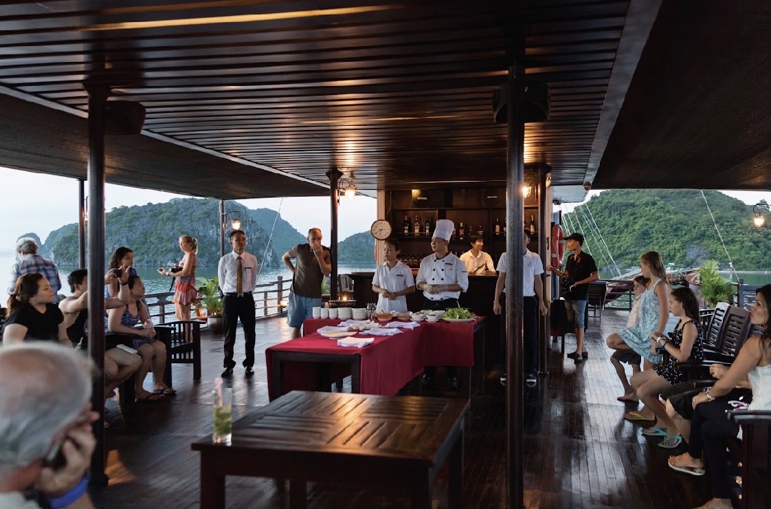 17:30 - 18:00 Du khách trở lại tàu để tham gia hoạt hai hoạt động Sunset party & Cooking class trên đường tàu về bờ. Du khách sẽ được tận hưởng những giây phút thư giãn nhâm nhi tách trà hoặc cà phê truyền thống của Việt Nam trên sundeck trong không gian thiên nhiên tuyệt vời và cùng ngắm hoàng hôn buông xuống. Vịnh Hạ Long ban ngày đã vốn yên tĩnh nhẹ nhàng nhưng khi hoàng hôn bắt đầu buông tím chân trời lại càng trở nên dịu dàng và yên bình.