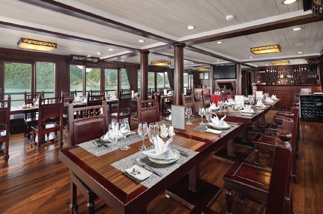 Quý khách thưởng thức bữa trưa tại nhà hàng sang trọng trên tàu trong khi du thuyền di chuyển đến khu vực Hang Sửng Sốt